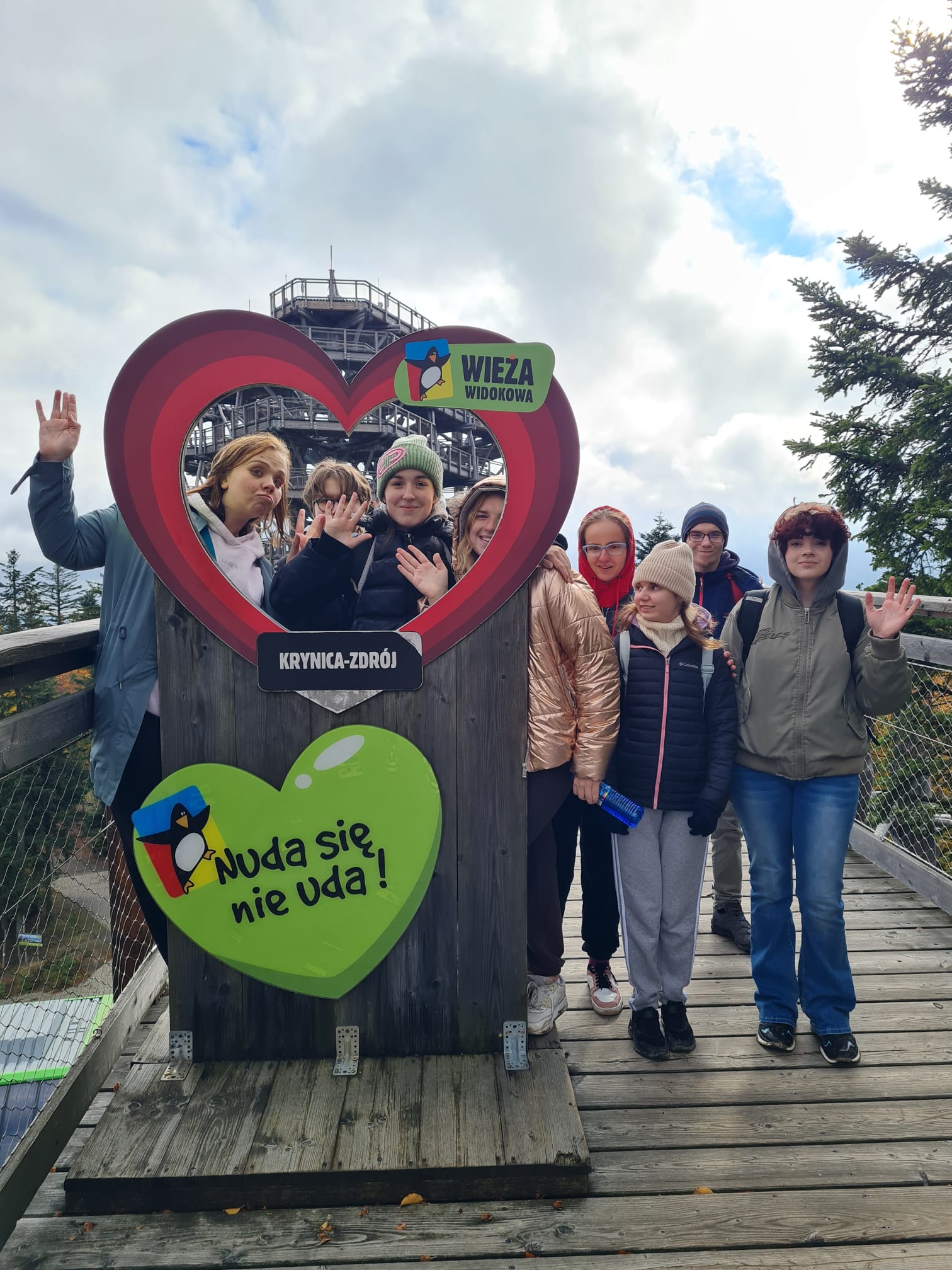 W pierwszym dniu uczniowie mieli okazję wejść na wieżę widokową w Krynicy Zdroju i przespacerować się w koronach drzew